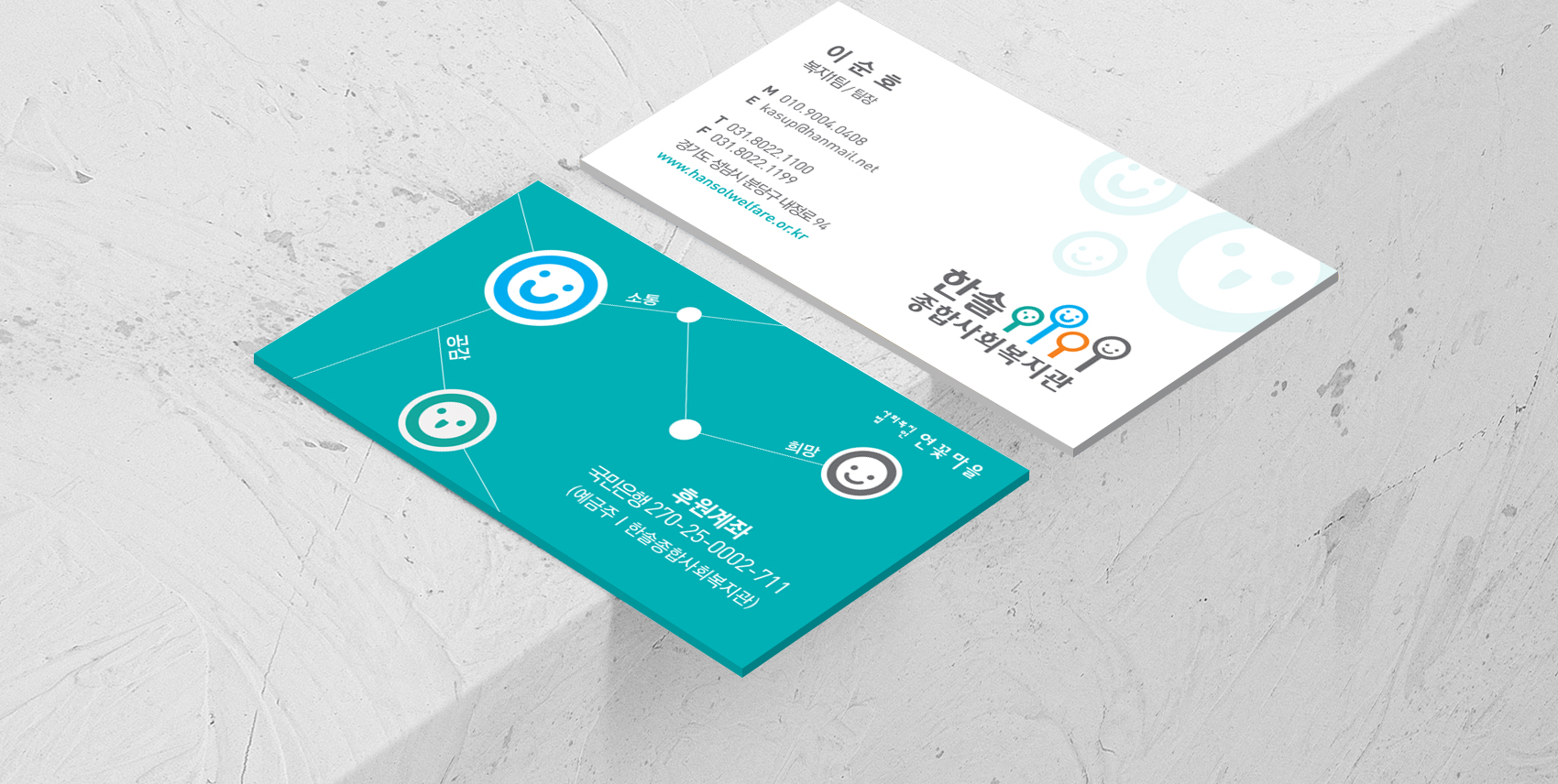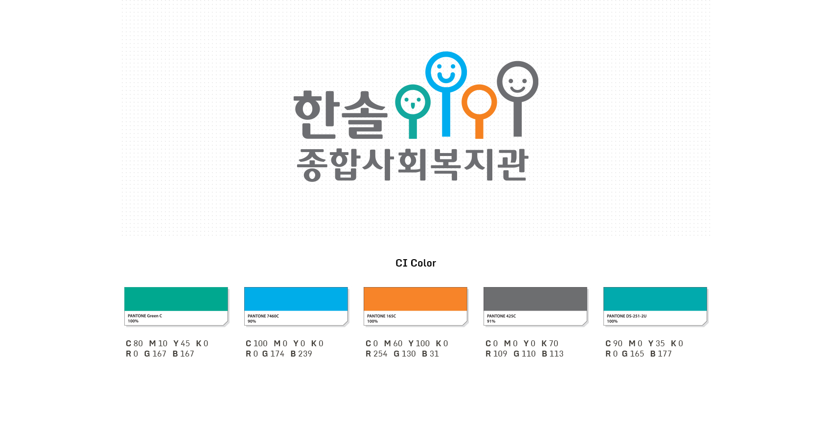 한솔종합복지관의 새로운 CI는 주민들과 종합복지관이 함께 상생한다는 의미와 행복을 느낄 수 있는 얼굴 표현들 그리고 어린아이와 어른 그리고 노인들이 함께 공존하는 의미를 느낄 수 있도록 컬러를 그린, 스카이블루,그레이를 사용하므로써 모든 연령과의 주민과 소통하고자 하는 의미를 표현하고자 노력하였습니다.