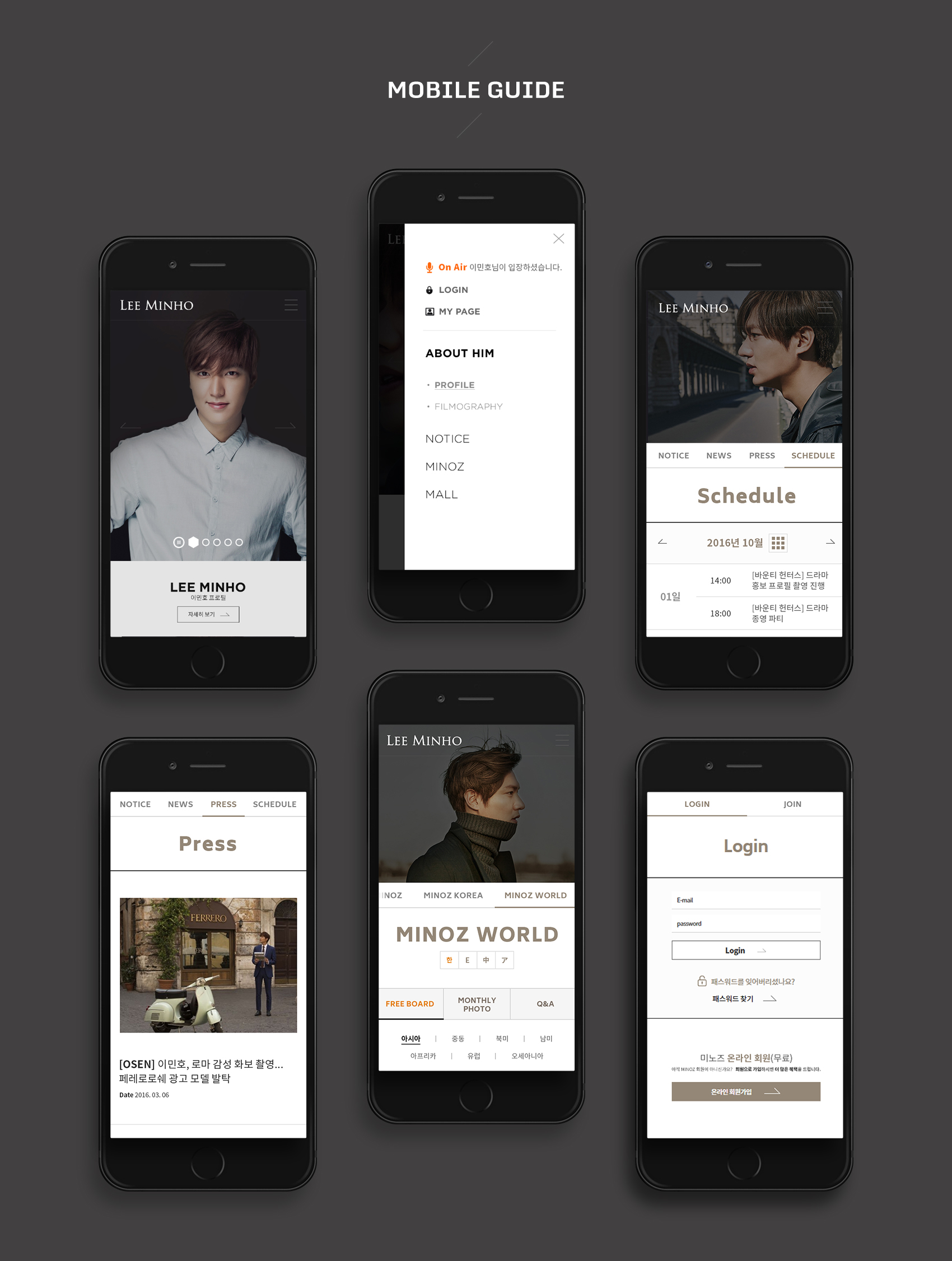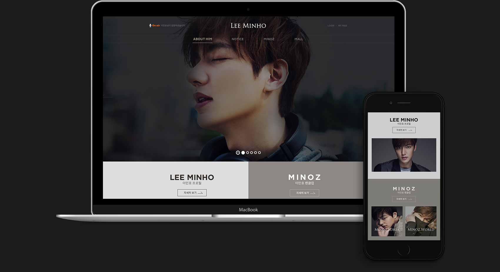 금번 이민호 공식 웹사이트는 배우 이민호를 잘 알 수 있는 콘텐츠 뿐만 아니라 이민호씨 입장소식, 월페이퍼, SNS 콘텐츠와의 연동을 통해 월드 배우에 손색없는 콘텐츠 기획구성과 미노즈코리아의 정회원만 누릴 수 있는 차별화적인 콘텐츠(갤러리, 팬러터 작성, 정회원 커뮤니티)로 구성하여 정회원 가입수를 증가시키는 방법으로 웹사이트를 개발하였습니다.
