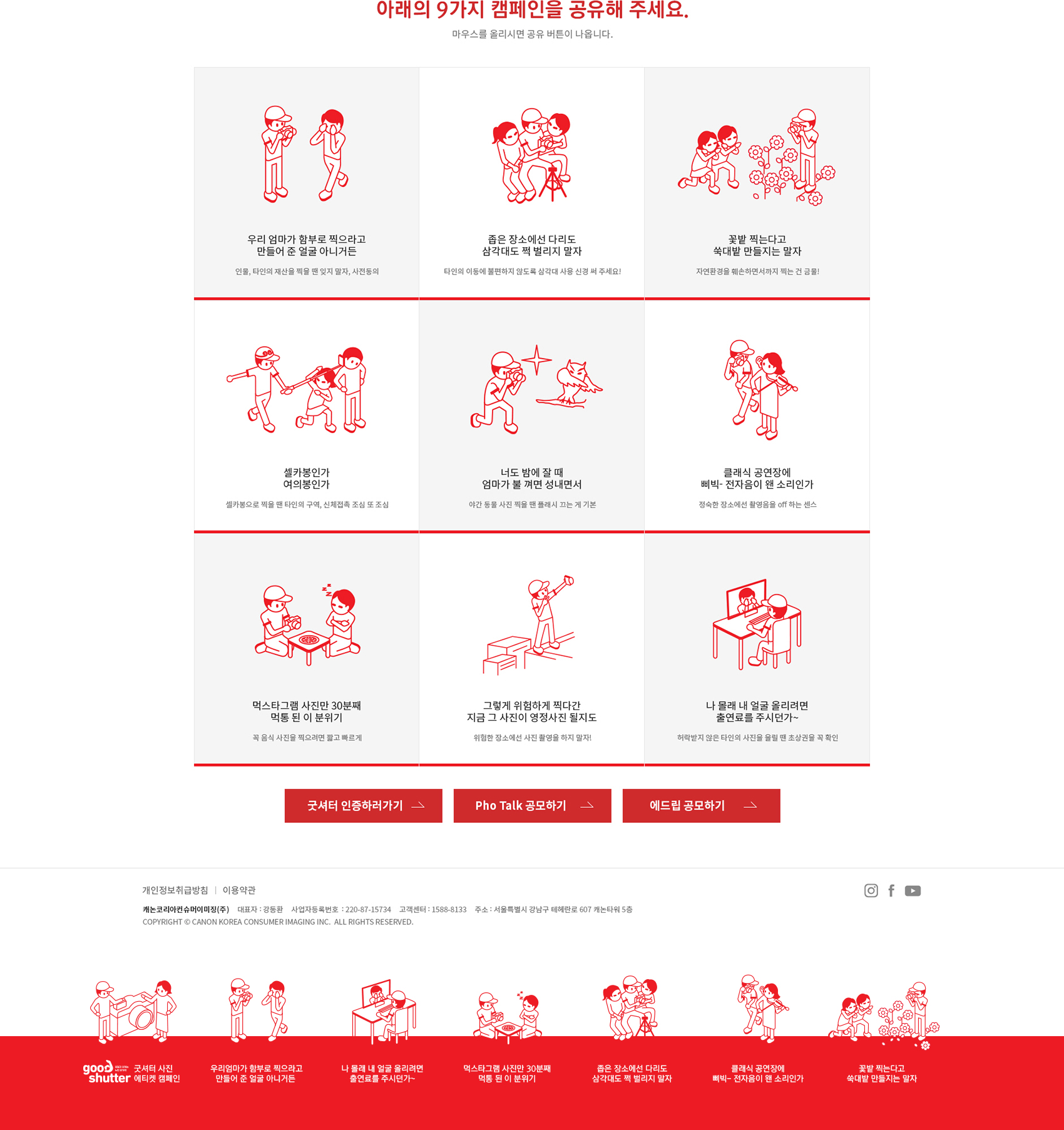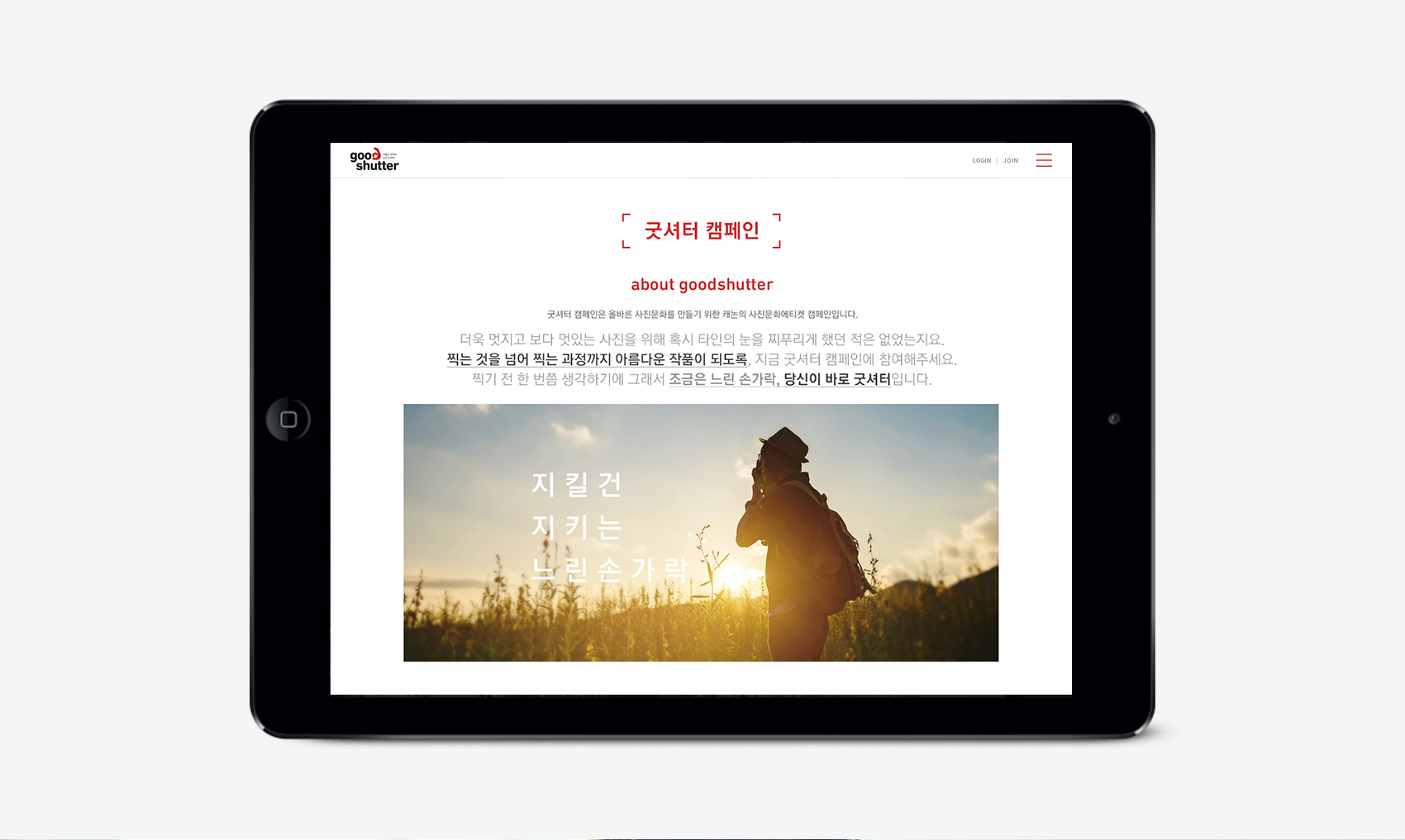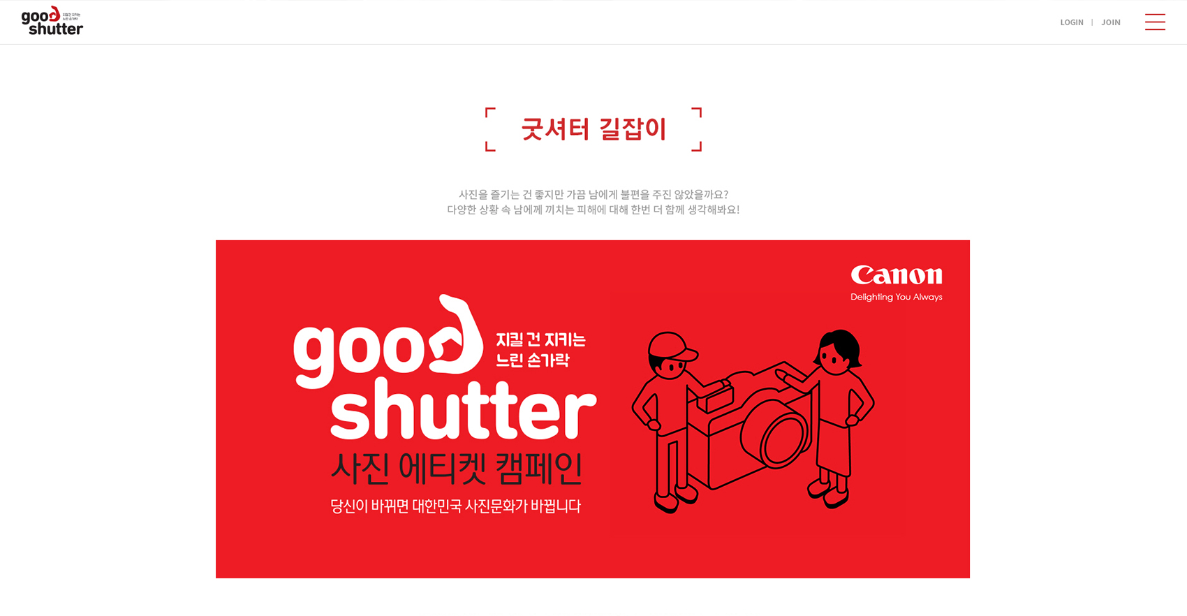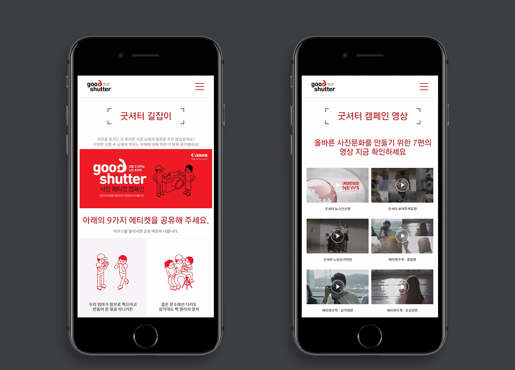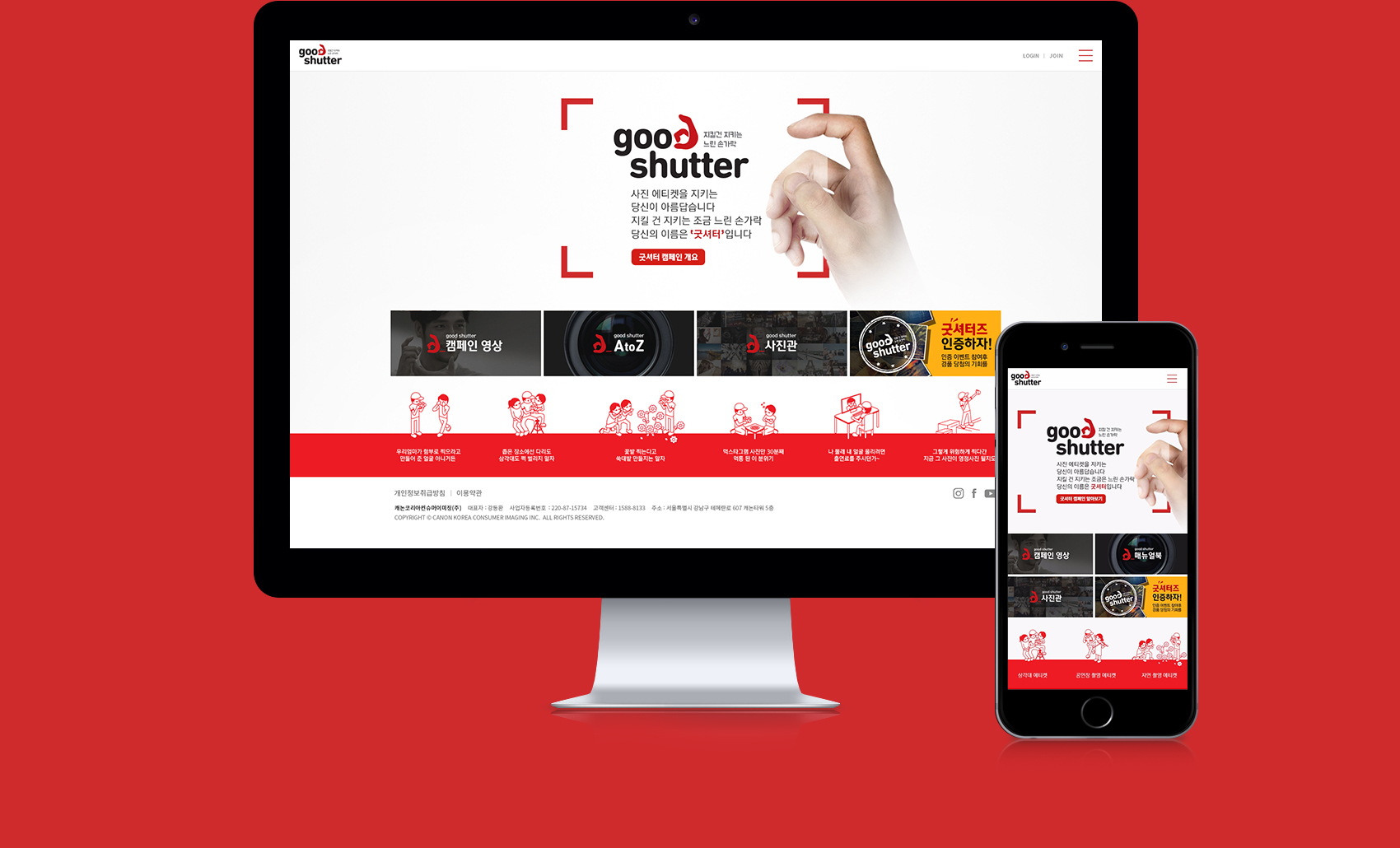 캐논은 카메라 업계 선도 기업으로서 제품 개발 및 유통, 판매 이외에 좋은 사진만을 위해 타인에게 피해를 끼치는 그릇 된 사진문화에 대한 경각심을 갖고, 결과물에 앞서 찍는 과정까지 아름다운, 올바른 사진문화를 만드는데 앞장서고자 ‘굿셔터 캠페인’을 기획하고 1년 동안 장기간 진행되는 캠페인 웹사이트를 디자인팝과 함께 구축하고 연간 운영 관리하는 대행사로 선정하였습니다.