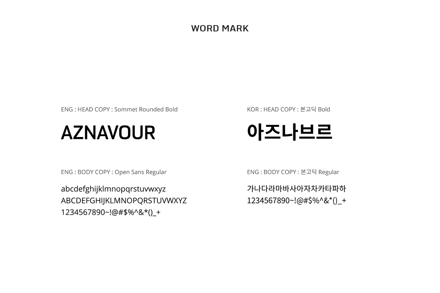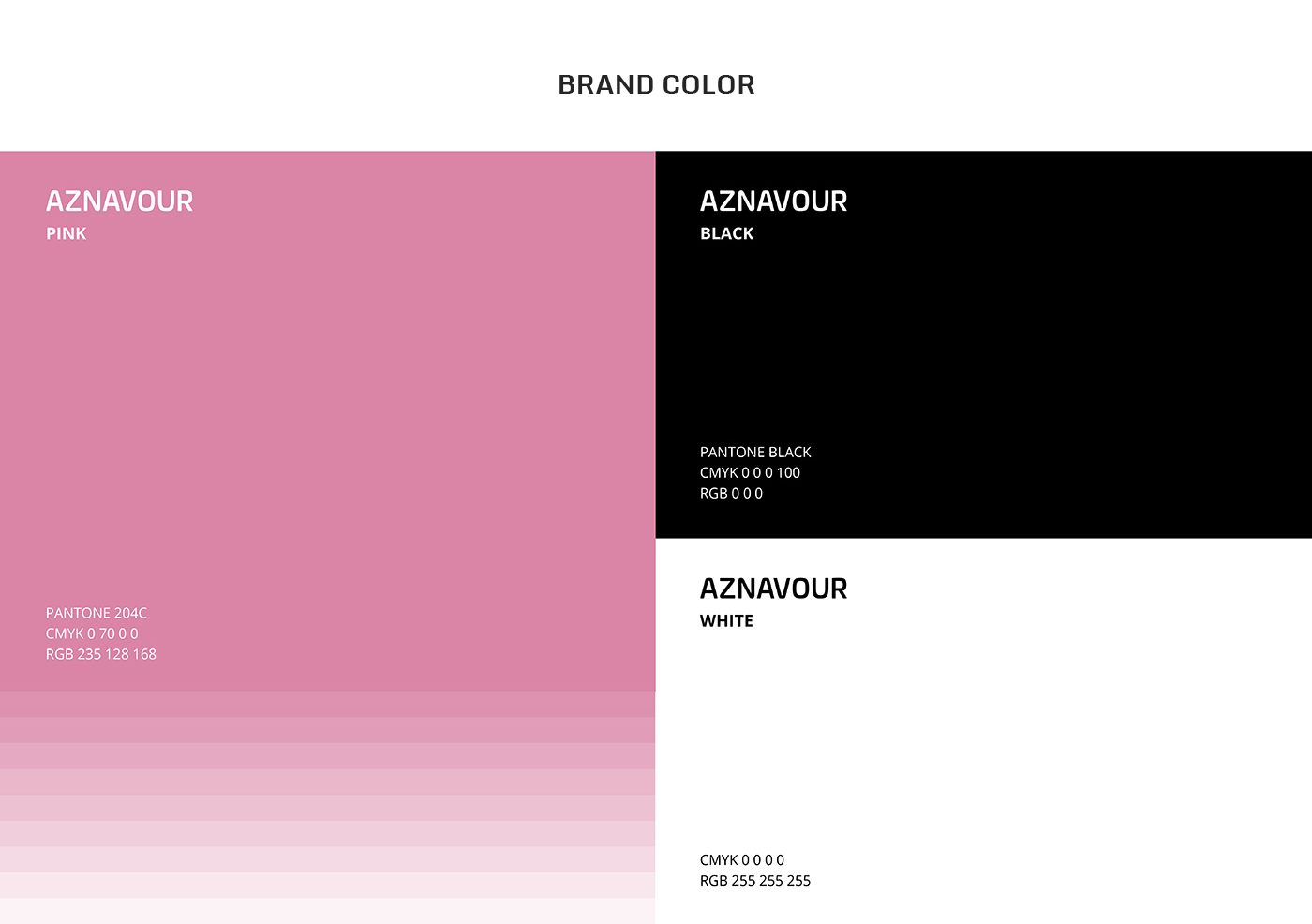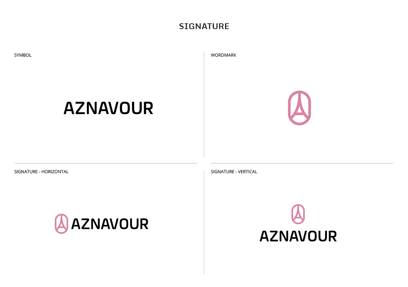 아즈나브르의 BI는 이니셜 A와 유럽을 상징적으로 표현할 수 있는 에펠탑을 모티브로 표현하였고, 둥글고 부드럽게 가공된 심벌 마크는 아즈나브르의 핵심 가치인 섬세하고 부드러운 기술력과 아름다움을 표현하였습니다. 또한 밝은 핑크 컬러를 브랜드 컬러로 사용해 여성스럽고 부드러운 브랜드 이미지를 부각하고 있습니다.