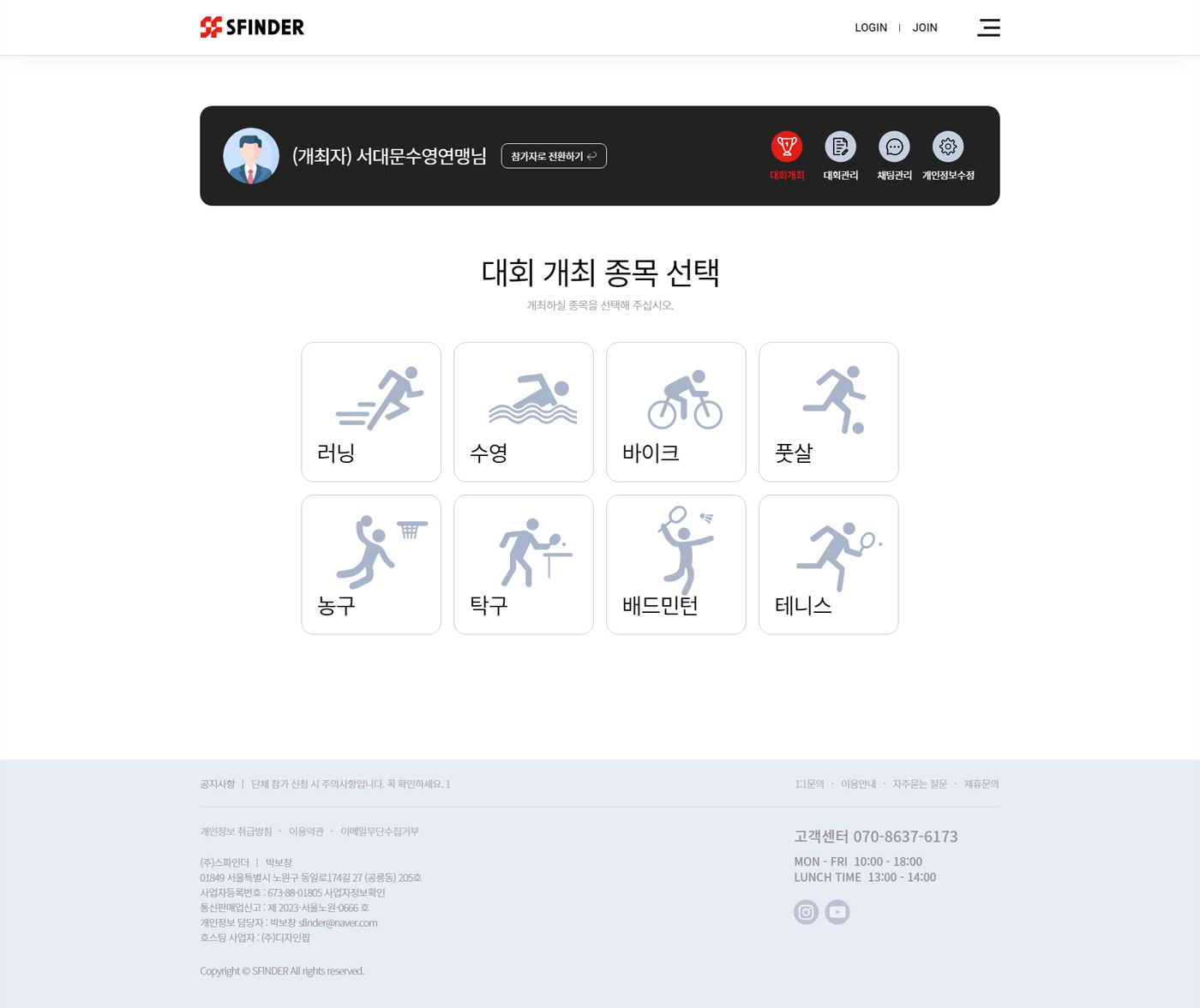 회원가입 후 개최자 회원으로 변경한 후 수영부터 ~ 테니스까지 총 8개의 종목(생활체육)을 선택하여 개최정보, 참가자 그룹, 종목설정을 통한 대회를 개최하실 수 있습니다.