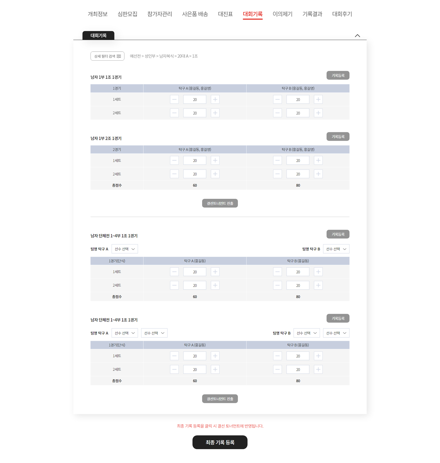 개최된 대회를 개최자가 관리하실 수 있는 구성으로 최적화 되어 접수 참여자 확인, 심판모집, 대진표 관리, 기록결과 등록(실시간), 후기 입력 등 전체적인 대회를 운영/관리하실 수 있습니다.