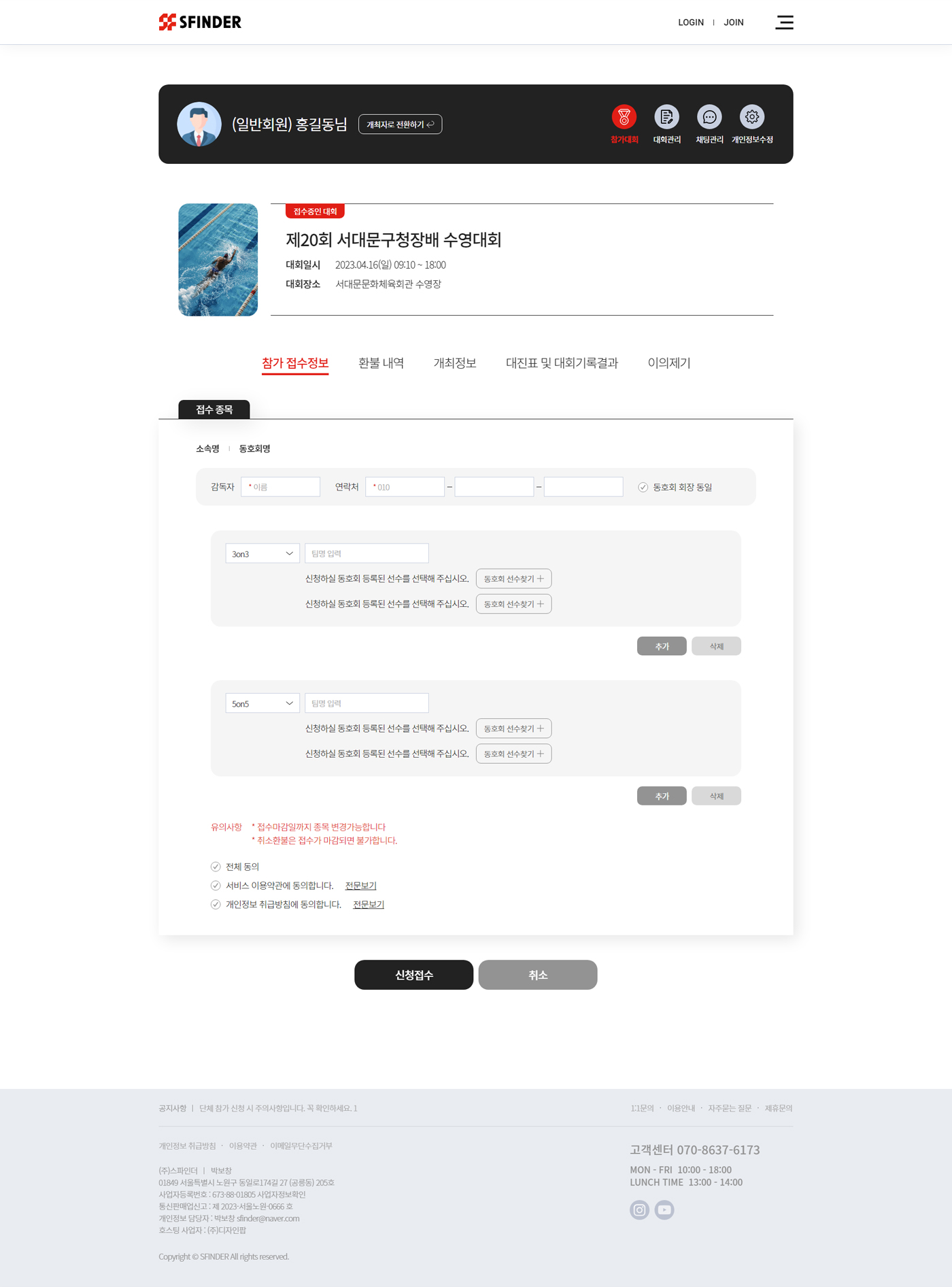 일반 참여자들은 대회를 쉽고 빠르게 접수할 수 있으며, 개인 접수가 가능하며, 동호회 개설/가입을 통해 단체에서 일괄적으로 대회에 접수가 가능한 플랫폼입니다.
