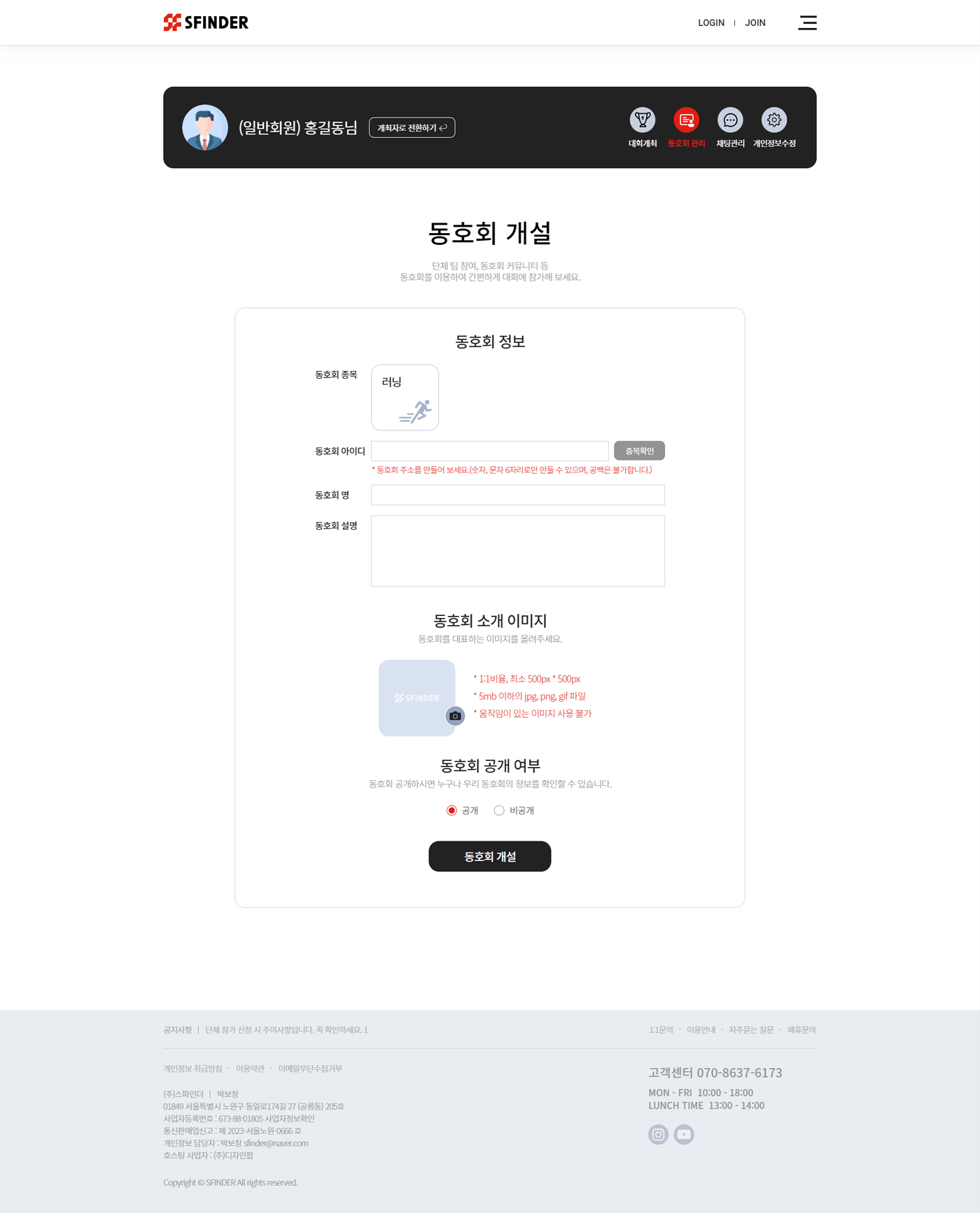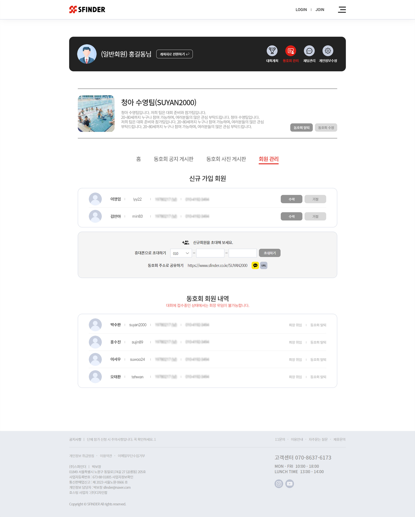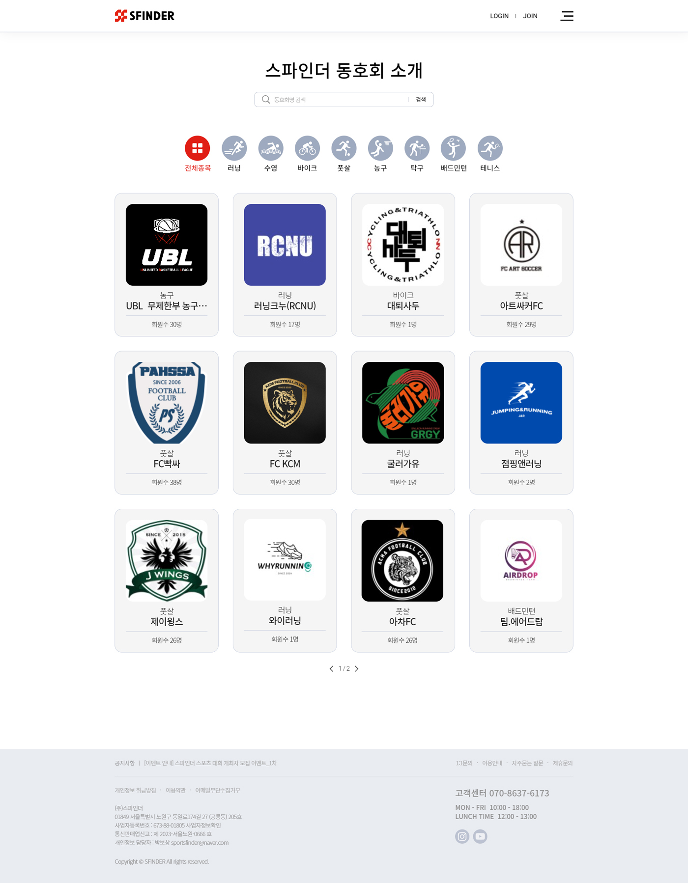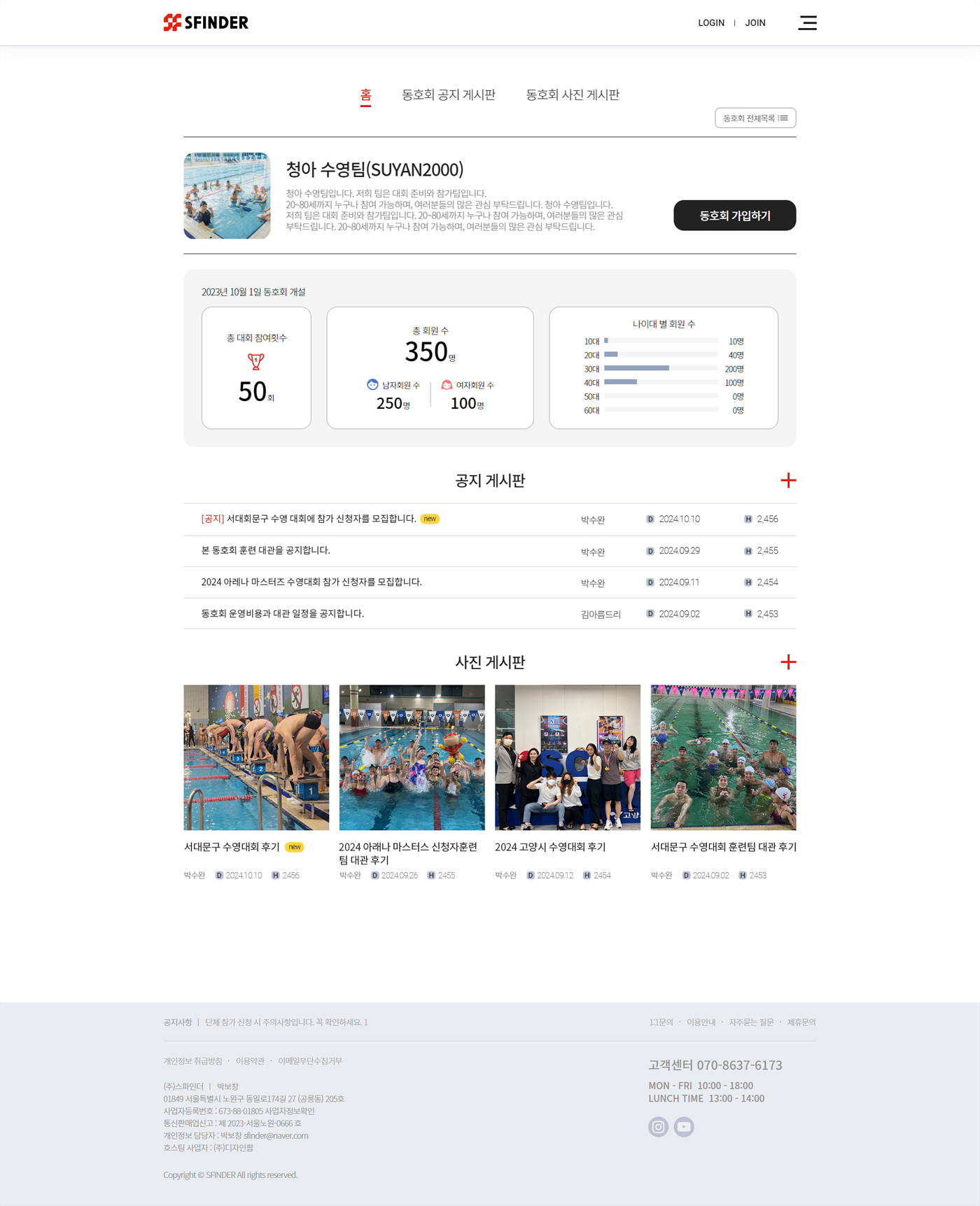 스파인더는 생활체육인의 동호회를 지원하기 위해 동호회 개설 및 참가, 동호회의 단체 접수를 가능하게 합니다. 또한 동호회의 소통을 위한 공지사항 및 게시판을 지원하여 동호회의 회원 및 운영을 관리할 수 있습니다.