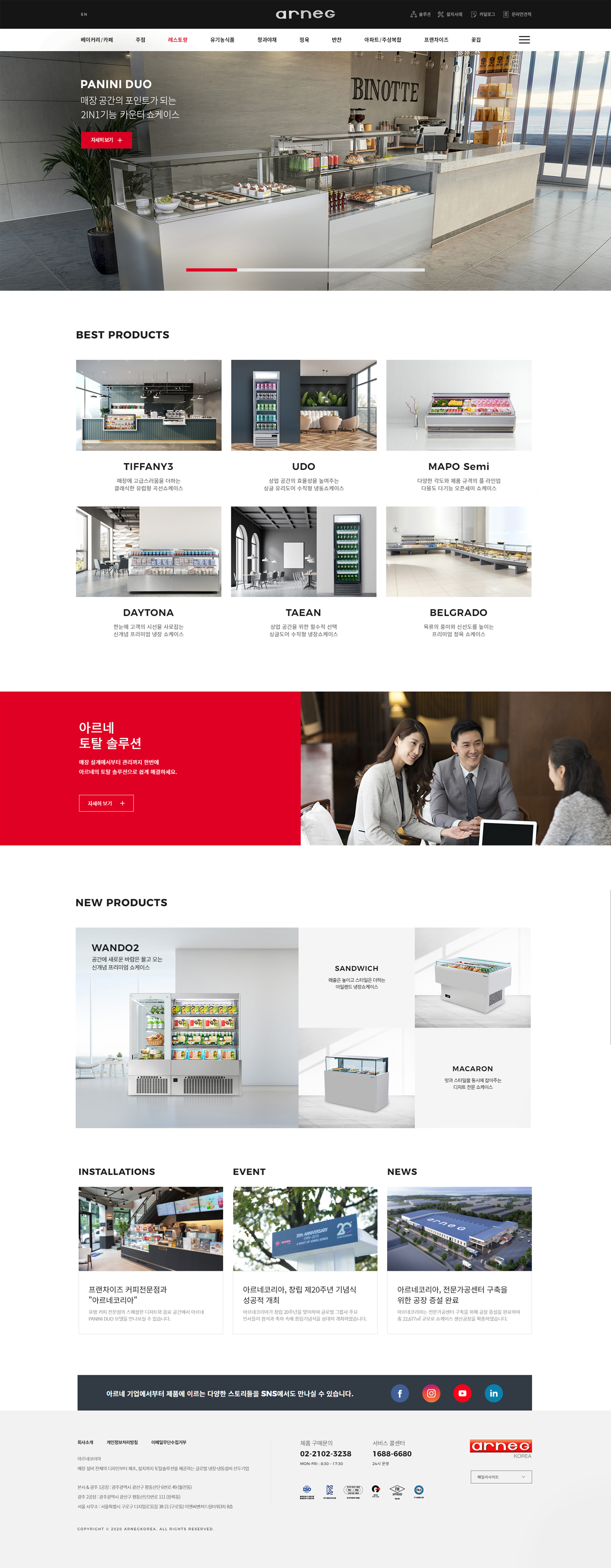 이번 아르네코리아의 온라인몰 프로젝트는 기존 글로벌 웹사이트 외 국내 시장(마트, 프랜차이즈, 편의점 등)의 영업망을 더 확장하고 소비자에게 제품의 정보를 쉽고 편리하게 제공하기 위한 영업플랫폼 시스템으로 쇼핑몰과 같은 제품정보 구축, 온라인 견적문의 시스템을 강조하였습니다.
